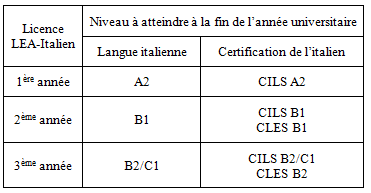 Depuis 2013, nos étudiants d’italien passent le certificat CLES et la certification CILS à la fin de l’année universitaire. Le contrat pédagogique prévoit que les étudiants atteignent un niveau de langue et réussissent un niveau de certification précis (Tableau 1).