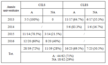 des années universitaires 2013/2016 ; pourcentages des étudiants admis (A) et non admis (NA)La portée des pourcentages positifs est accentuée si l’on pense que presque la moitié des étudiants non admis (8/18) sont concernés par la session CILS du mois de juin 2016. Ces candidats n’ayant pas réussi une épreuve, voire deux, cas plus rare, passent les épreuves échouées lors de la prochaine session de cette certification, prévue pour le mois de décembre 2016. Nous pensons qu’ils obtiendront très probablement leur certification.