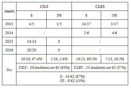 Les pourcentages sont rassurants : plus que 70% des étudiants ont réussi la certification visée. Les taux de réussite des deux certifications sont très proches : CILS 72%, CLES 69.5% (Tableau 3).