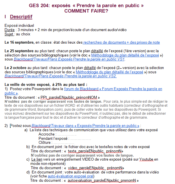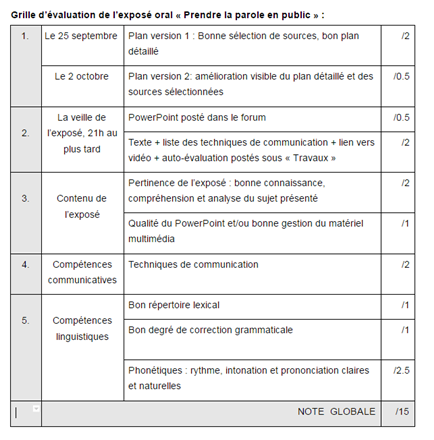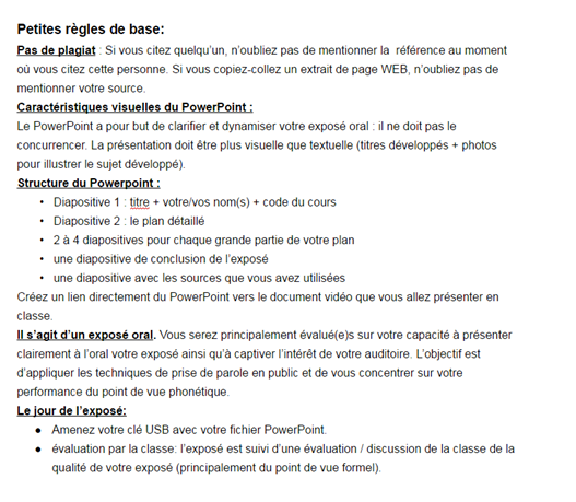 Sur le plan linguistique, pour les travaux écrits (le plan, le PowerPoint et le texte de l’exposé), nous insistons sur le fait que les étudiants doivent systématiquement autocorriger leurs fautes de langue avant de poster leurs travaux. Pour ce faire, ils sont initiés en classe au correcteur d’orthographe et de grammaire Word et à Bonpatron.