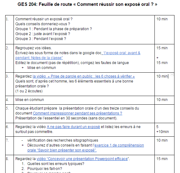 L’étape suivante, la plus difficile pour les étudiants, concerne le plan de l’exposé. Par le biais de diverses activités en classe, les étudiants apprennent quelle est la structure du plan d’exposé et comment l’élaborer à partir des informations récoltées précédemment. Ils postent sur Blackboard la 1re version de leur plan et reçoivent rapidement un feedback de l’enseignante pour leur permettre d’améliorer leur plan, une 2e version qu’ils postent à nouveau sur Blackboard. En général, et si l’apprenant a bien pris en compte son feedback, l’enseignante valide cette 2e version. Au cas où ce n’est pas le cas, l’enseignante aide l’élève à corriger son plan ou lui propose de lui envoyer une 3e version tenant mieux compte du feedback.
