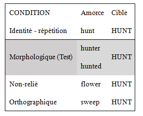 En fonction des hypothèses de l’expérience, l’amorce peut partager différents types de relation avec la cible. Si l’amorce correspond exactement à la cible (la condition ‘répétition’, par exemple angl. hunt - HUNT), les temps de réaction pour la reconnaissance de cette dernière seront généralement les plus courts, par rapport aux autres conditions ; à l’opposé, si l’amorce n’a aucun lien avec la cible (condition non-reliée, par exemple angl. flower - HUNT) aucune facilitation n’est attendue sur les TR. Ces deux conditions (identité/répétition et non-relié) représentent les points de repère pour évaluer l’effet d’une amorce morphologiquement reliée (ou condition test, dans notre cas) sur la cible, qu’il s’agisse d’une forme du même paradigme flexionnel (par exemple hunted – HUNT) ou des membres d’une même famille morphologique (par exemple hunter – HUNT).