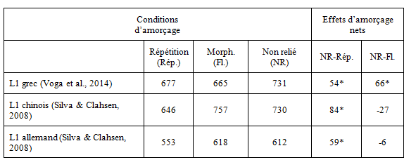 Table 2: Temps de réaction (en ms) des décisions lexicales pour les trois conditions d’amorçage (répétition, morphologique – flexion et non reliée) de l’étude Voga et al. (2014) et Silva & Clahsen (2008). Les effets nets d’amorçage qui sont statistiquement significatifs sont dénotés par un astérisque.