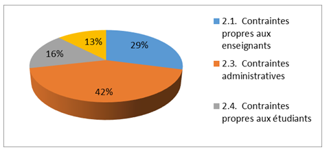 Les résultats de cette deuxième partie (Fig. 6) visant à faire apparaître les écueils et difficultés de la mise en place de la PA, révèlent qu’il existe un certain nombre de facteurs qui semblent exercer une influence sur les choix des enseignants, tels que les contraintes administratives (42%), les convictions et les représentations des enseignants (29%), les contraintes propres aux étudiants (16%), le coût (13%).