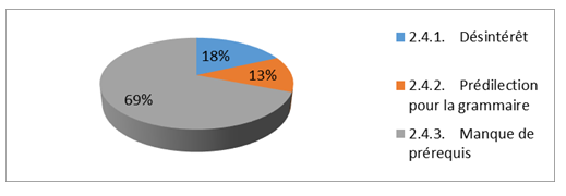 Les contraintes propres aux étudiants semblent constituer également un écueil à la mise en place de la nouvelle perspective, mais à un degré moindre : 16% (Fig. 6). Au sein de cette rubrique, le « manque de prérequis » (69%) est l’élément le plus cité. Viennent ensuite (Fig. 9) le « désintérêt des étudiants » (18%) et leur « prédilection pour la grammaire » (18%). Si le premier facteur nous semble tout à fait logique car susceptible, à notre avis, d’entraver la mise en place de la PA, nous trouvons très étonnant le fait d’évoquer le désintérêt des étudiants et leur prédilection pour la grammaire comme étant des obstacles à l’implémentation de cette perspective. Nous pensons être en droit de nous demander si le désintérêt et la prédilection pour la grammaire évoqués n’émanent pas des enseignants eux-mêmes.