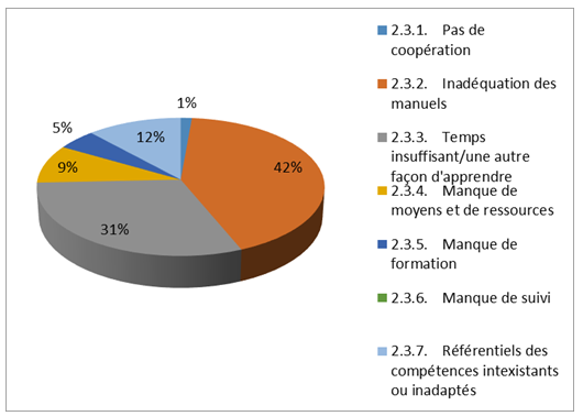 Les résultats de la recherche font apparaître, par ailleurs, qu’il existe des difficultés de taille pouvant entraver la mise en place de la PA. L’inadéquation des manuels, le manque de ressources, le manque des prérequis, les représentations et les convictions des enseignants fortement ancrées au sujet des objectifs de l’enseignement d’une langue étrangère, etc., sont autant de facteurs qui pourraient rendre difficile l’implémentation de la nouvelle perspective.