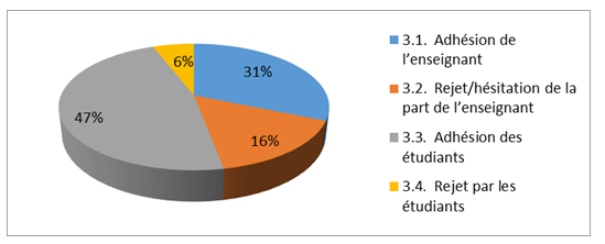 Les attitudes des enseignants et des étudiants, comme le montrent la Figure 11, semblent en général favorables à l’égard de la PA. La rubrique « adhésion de l’étudiant » reçoit la valeur de 47%, celle de « adhésion de l’enseignant » recueille 31% de l’ensemble des occurrences de cette rubrique. Ces résultats nous paraissent logiques ; la PA est bien accueillie dans l’ensemble mais il reste des réticences dans son adoption.