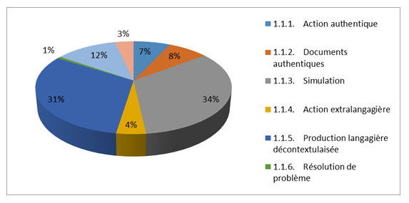 Les résultats montrent que la notion de la tâche est bien présente dans le discours des enseignants mais que la conception qu’en ont les enseignants ne correspond pas à celle prônée par les chercheurs en didactique de langue. En effet, la conception de la tâche dominante, comme le montre la Figure 2, est celle de « production langagière décontextualisée » (31%) qui se réalise par l’intermédiaire de « simulations » (34%) en classe. La notion de tâche comme « action authentique » débouchant sur la réalisation d’un produit concret et celle se basant sur la résolution des problèmes ne recueillent que 7% et 1% respectivement. Il semblerait donc que la notion d’action authentique située, désignée dans la littérature comme étant une des caractéristiques de base de la PA, ne soit pas ancrée dans les pratiques des enseignants.