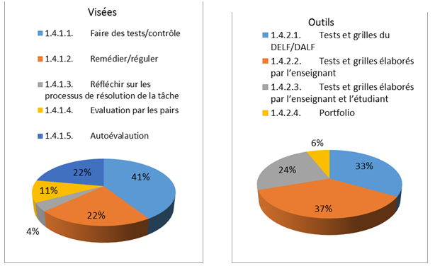 Les pratiques évaluatives des enseignants au vu des résultats de cette rubrique (Fig. 5) semblent porter de premier chef sur le contrôle puisque l’item « faire des tests ou des contrôles » porte la valeur la plus élevée : 41%. Mais les résultats montrent également que d’autres pratiques évaluatives sont privilégiées bien qu’à degré moindre. Il s’agit de pratiques évaluatives visant la remédiation (22%), l’autoévaluation (22%) et l’évaluation par les pairs (11%). Ces résultats montrent, à notre avis, que les pratiques évaluatives des enseignants ne s’inscrivent pas forcément dans le cadre de la PA. L’évaluation qui serait le plus en conformité avec l’esprit de cette perspective devrait être, selon Puren (2008), une « évaluation orientée action » et viser d’emblée le « maintien d’une activité dite de métacognition ». Il est vrai que les contraintes administratives imposent parfois un type d’évaluation bien déterminé, mais le manque de centration sur l’autoévaluation et la quasi absence de référence (4%) à la « réflexion sur les processus de résolution de la tâche » nous portent à croire qu’il s’agit toujours d’une évaluation qui n’assure pas suffisamment l’implication des apprenants et le développement des compétences. Les résultats de la seconde rubrique relative aux outils de l’évaluation vont dans ce sens. Les outils d’évaluation utilisés sont élaborés par l’enseignant (37%) ou sont ceux du DELF ou DALF (33%). Les grilles élaborées par l’enseignant et les étudiants représentent 24% et la notion du portfolio semble quasiment absente (6%). Cette conception de l’évaluation ne convient pas, à notre sens, aux exigences de la PA qui attribue à l’évaluation des fonctions qui dépassent les pratiques des évaluations formatives et sommatives classiques.