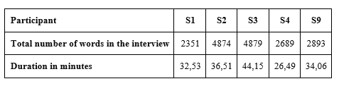 The interviews were conducted in English, a language imposed by the researcher as it was the language that all the participants mastered the best. The number of words used by every participant and the duration of each interview are presented in Table 4. Forty questions were asked. In a general way, the researchers tried to see whether the participants were going to give similar answers in their interviews and in their written texts as to apply the triangulation principle of data (Wodak, 2009).
