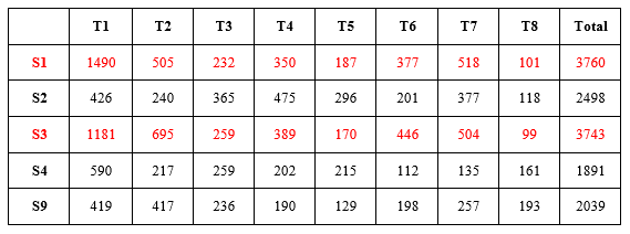 Table 2 - Number of words in every text (T) by S1, S2, S3, S4, S9 [4]
