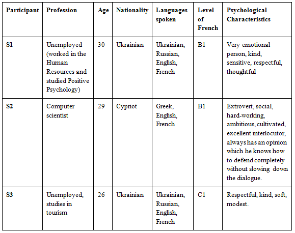 Our participants consisted of a group of 11 adults, but we will be focusing on three of them, one man and two women whom we called (S1, S2, S3). Their ages varied from 19 to 70 years old. The participants were studying French in order to achieve Levels B1, B2 or C1 of the Common European Framework of Reference for Languages. A more detailed description of S1, S2 and S3 is given in the table below (Table 1).