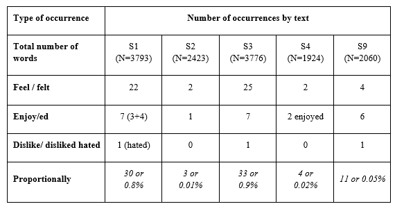 The frequencies and uses of the paradigms of emotion words feel, enjoy, hate/dislike and the use of words expressing subjectivity (such as adverbs).