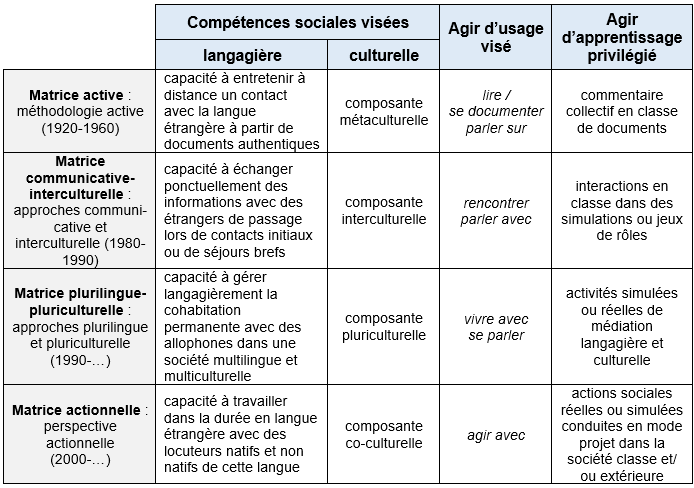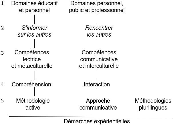 – La ligne 3 correspond aux « compétences sociales de référence », langagière et culturelle : c’est-à-dire à ce qu’on veut que l’élève soit capable de faire en langue-culture étrangère à la fin de sa formation. Lire et comprendre des textes pour entraîner ses connaissances langagières et culturelles, extraire de ces textes de nouvelles connaissances langagières et culturelles dans la méthodologie active [5] ; interagir langagièrement avec des étrangers, découvrir leur culture et prendre conscience de la sienne tout en la relativisant, dans l’« approche communicative-interculturelle » (concernant cette dernière expression, cf. infra note 7).