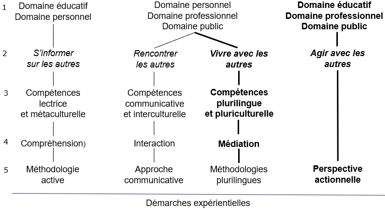 Ces deux enjeux vont faire appel à une nouvelle action sociale de référence, à savoir la médiation (langagière et culturelle), avec laquelle les méthodologies plurilingues préexistantes viennent tout naturellement s’articuler. Le tableau peut être complété de la manière suivante (voir parties en gras) :
