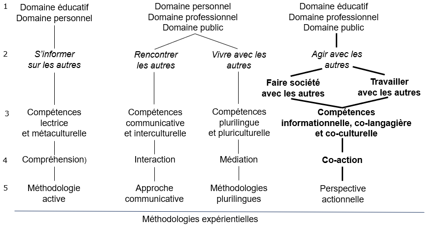 L’élaboration de la perspective actionnelle, telle que je l’ai impulsée pour ma part dès la publication du CECRL [13], a complété le tableau des méthodologies disponibles de cette manière (voir parties en gras).