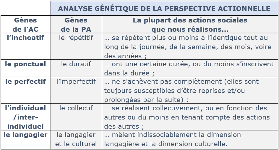 – L’action sociale de référence, celle de l’« acteur social » dont parlent les auteurs du CECRL, est la « co-action », c’est-à-dire l’action commune à finalités et/ou objectifs partagés, dont le modèle de référence contemporain, dans tous les domaines - qu’il soit public, professionnel ou éducationnel -, est le projet. Les deux tableaux suivants, extraits de mon article intitulé « Approche communicative et perspective actionnelle, deux organismes méthodologiques génétiquement opposés... et complémentaires » (2014a), présente ainsi les « gènes », ou caractéristiques fondamentales, de l’agir touristique, pour l’approche communicative, et de l’agir social, pour la perspective actionnelle.
