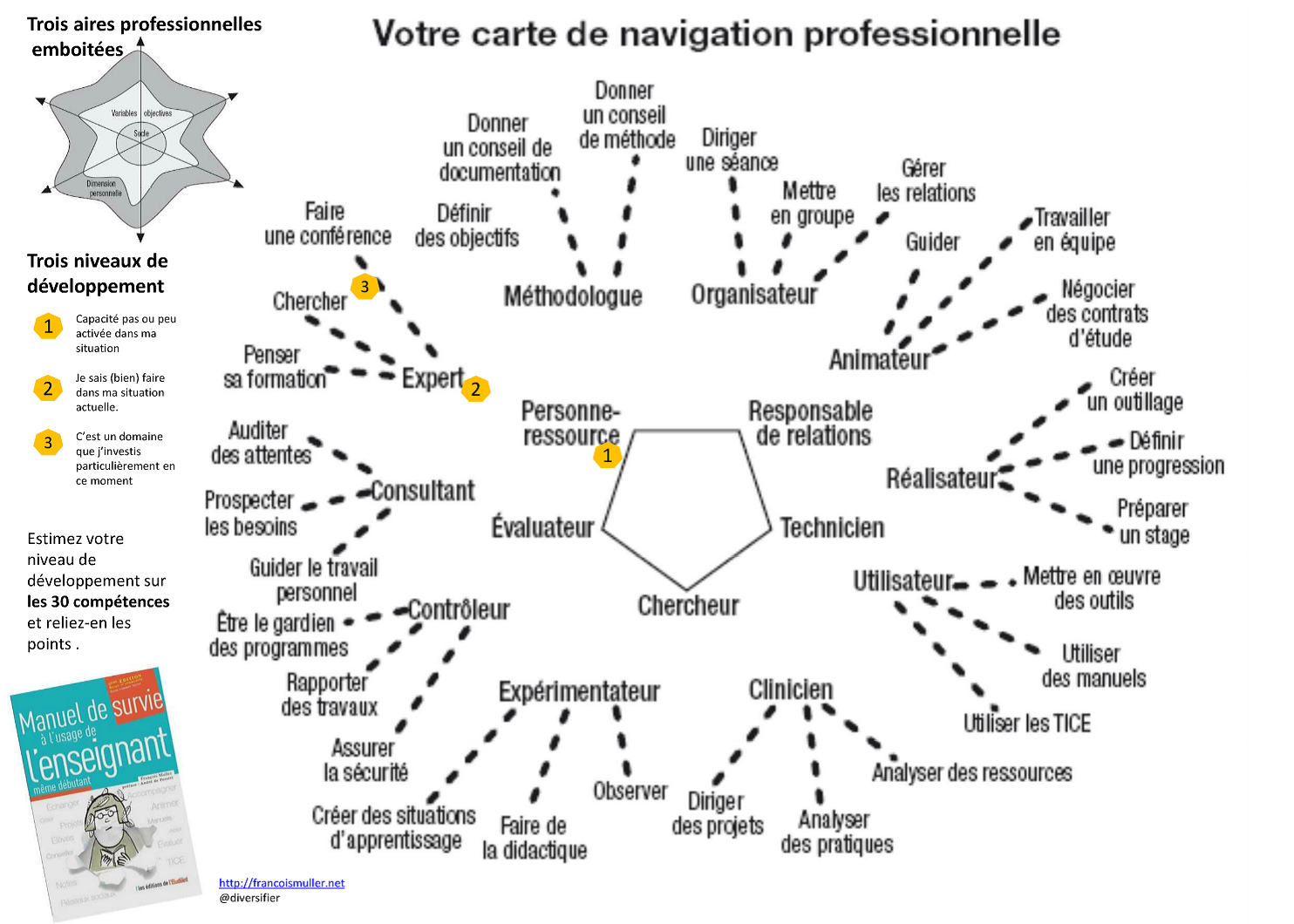 S’engager dans l’innovation, c’est d’abord assumer les questions professionnelles, se livrer à un « miroir des pratiques » avec humilité et courage autant qu’avec fierté. Saurez-vous ici construire votre « carte de navigation professionnelle » en identifiant votre niveau de maitrise dans les compétences ou domaines de compétences, et celles que vous allez explorer très vite ?