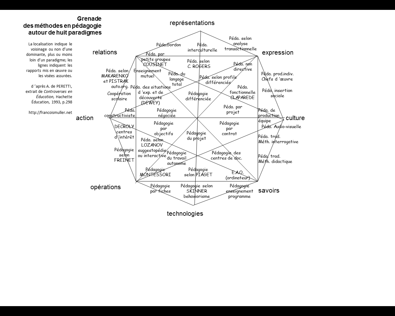 Avec André de Peretti, nous avions élaboré, à partir de la « Grenade des pédagogies » une sorte d’arborescence des méthodologies référées aux domaines ou champs ciblés. Il ne s’agit pas d’opter pour une pédagogie et une seule, mais de varier votre pratique au gré des pôles que vous souhaitez développer avec, par et pour vos élèves ou étudiants. Osez, expérimentez, renseignez-vous, parlez-en autour de vous. C’est le début de votre aventure souvent.