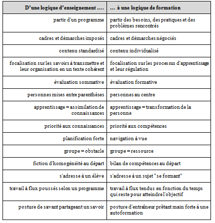Le tableau synoptique ci-dessous en deux colonnes (logique d’enseignement, logique de formation), permet pour chacun d’entre nous de nous interroger sur la place où nous mettons le curseur, avec intensité variable et variée selon les cas rencontrés.