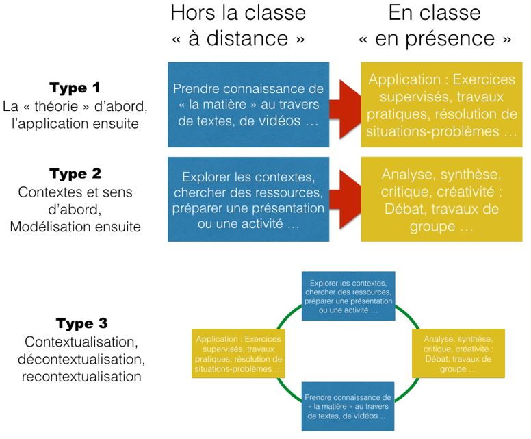 – le Type 1 très proche de la définition initiale, les leçons « à la maison » et les devoirs à l’école. Il s’agit d’un ensemble de configurations dans lesquelles les savoirs, définis par l’enseignant, sont transmis hors la classe par le moyen de différents médias (dont les vidéos) et où le temps en présence est favorablement consacré aux exercices, aux applications et à des situations-problèmes