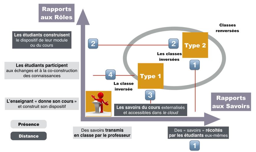– Finalement, nous avons complété la figure par une stratégie de formation, les « classes renversées » dans laquelle les élèves ou les participants à la formation y contribuent maximalement [4] à la fois au niveau des savoirs travaillés, des activités prévues (pour les autres élèves, par exemple) en assumant tout à la fois les rôles d’enseignant et d’apprenant.