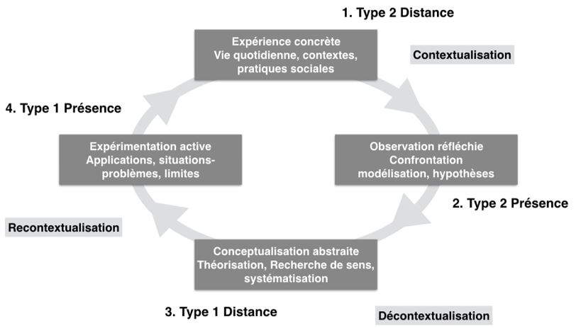 – Temps 1. Socialisation : Seul ou en petit groupe, l’apprenant part à la rencontre du contexte, des éléments de la vie quotidienne ou socio-professionnelle. Ces conceptions spontanées peuvent déjà être ébranlées par cette rencontre avec le terrain et aussi au sein du petit groupe d’explorateurs dont il fait partie. L’implicite se révèle, se traduit en situations, s’explicite (Type 2, distance).