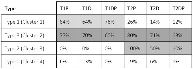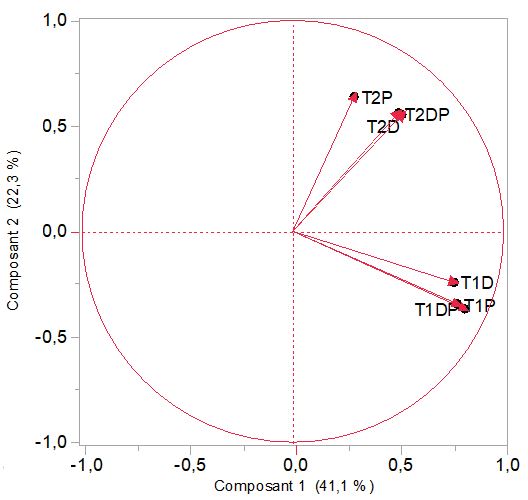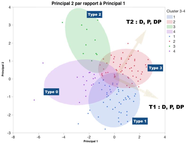sur les 6 items descriptifs retenusCette analyse illustre la bonne corrélation entre les items au sein d’un type donné (Rho de Spearman de 0,64 entre T1P et T1DP, de 0,42 entre T1P et T1D, et de 0,26 entre T2P et T2DP, de 0,35 entre T2D et T2DP) et la bonne discrimination entre les deux séries d’items caractéristiques des deux types proposés.