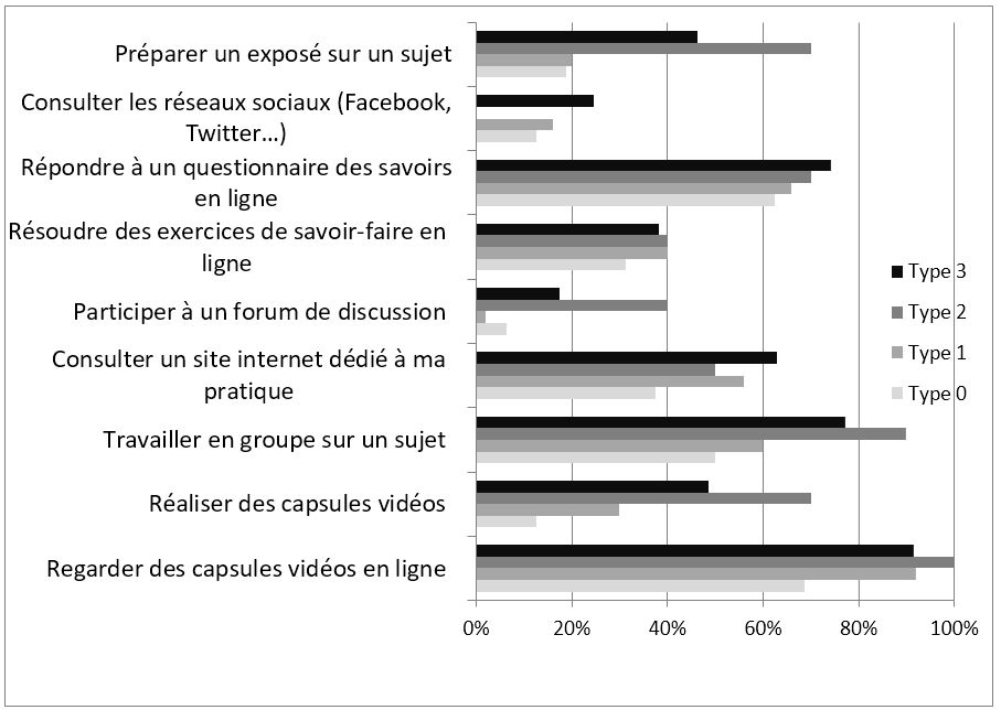 Les items « Consulter un site dédié à ma pratique », « Résoudre des exercices de savoir-faire en ligne », « Consulter les réseaux sociaux », « Répondre à un questionnaire des savoirs en ligne » ne présentent pas de différences significatives en fonction des types, même si le dernier concernant les questionnaires récolte un nombre élevés de réponses positives (y compris pour le Type 0).