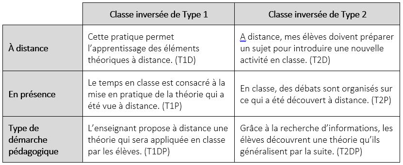 La première partie de cette recherche visait à dresser une typologie des classes inversées. À partir de nos données, nous avons pu mettre en évidence deux types principaux de classes inversées (Figure 16) :