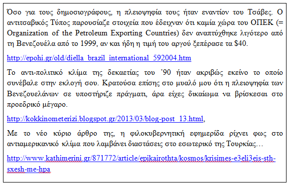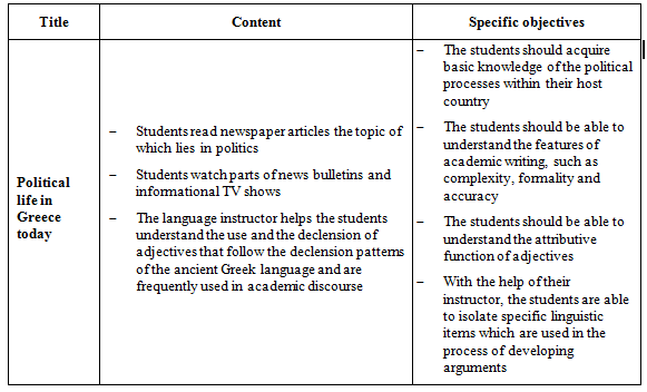 The general objectives of this lesson would be the following: (a) students should understand TV segments and politically oriented conversations in Greek, enhance their performance in academic discourse, become sensitive to and understand the different linguistic styles that native speakers use; enhance their ability to read texts through a critical point of view and understand socially constructed concepts that lie beneath (Fairclough, 2013), e.g. sex inequality issues; (b) students should gain access to useful information about the political and social situation of their host country; (c) students should be able to integrate into their performance more sophisticated linguistic items and understand their function in the target-language; furthermore, they learn to promote their ideas and discuss different views civilly yet assertively.