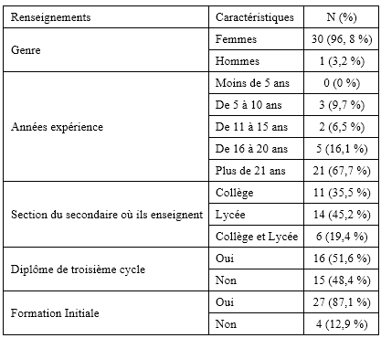 Tableau 1 - Description des caractéristiques des enseignants du secondaire (N=31)