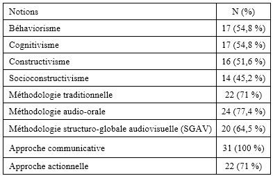 Tableau 2 - Notions que les enseignants déclarent connaitre (N=31)