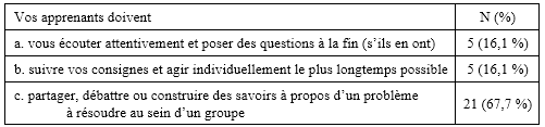 De plus nous avons demandé aux enseignants de nous préciser ce que leurs apprenants doivent faire pendant le cours, en leur demandant de choisir une réponse parmi les trois proposées : a. vous écouter attentivement et poser des questions à la fin (s’ils en ont), b. suivre vos consignes et agir individuellement le plus longtemps possible, c. partager, débattre ou construire des savoirs à propos d’un problème à résoudre au sein d’un groupe. Comme nous pouvons le constater dans le tableau 4, 16,1 % des sondés déclarent que les apprenants doivent écouter attentivement le professeur et poser des questions à la fin (s’ils en ont), 16,1 % que les apprenants doivent suivre ses consignes et travailler individuellement le plus longtemps possible et 67,7 % que les apprenants doivent partager, débattre ou construire des savoirs à propos d’un problème à résoudre au sein d’un groupe (Tableau 4).