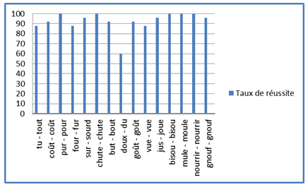 Nous avons fait une analyse plus détaillée des deux tests, item par item, pour le groupe du Niveau 1, plus nombreux (ce qui assure des résultats plus fiables), et pour lequel l’opposition /y/ vs /u/ était un domaine de la prononciation du français travaillé systématiquement dans le programme du cours. Pour le test de discrimination des paires minimales, le taux de réussite est supérieur à 80% pour tous les items (Fig. 5), sauf pour le couple doux-du, une exception qui reste à élucider puisque selon la méthode verbo-tonale, le contexte consonantique de l’occlusive sonore n’est pas particulièrement défavorable à la perception de /y/.