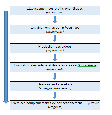 Nous présentons maintenant phase par phase la procédure de remédiation phonétique schématisée dans la Fig. 1. A gauche la flèche représente le déroulement du cours dans la salle de classe (où la phonétique est corrigée à l’occasion). À droite on voit la succession chronologique des étapes de la procédure de remédiation hors de la classe.