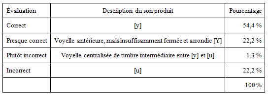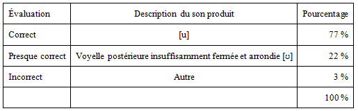 On observe donc un taux de réussite de 54% pour /y/ et de 77% pour /u/. Nous avons comparé ces résultats à la prononciation des deux voyelles dans les données relevées lors de l’établissement des profils au début du cours (cf. 3.1) : seuls 15% des étudiants du Niveau 1 avaient alors prononcé /y/ correctement, et 25% /u/ correctement.