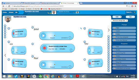 Le test consiste en deux sections, répétition de mots et répétition de phrases. Pour la réalisation de ce test, nous avons utilisé le laboratoire de langues numérique Schoolshape (Fig. 7).