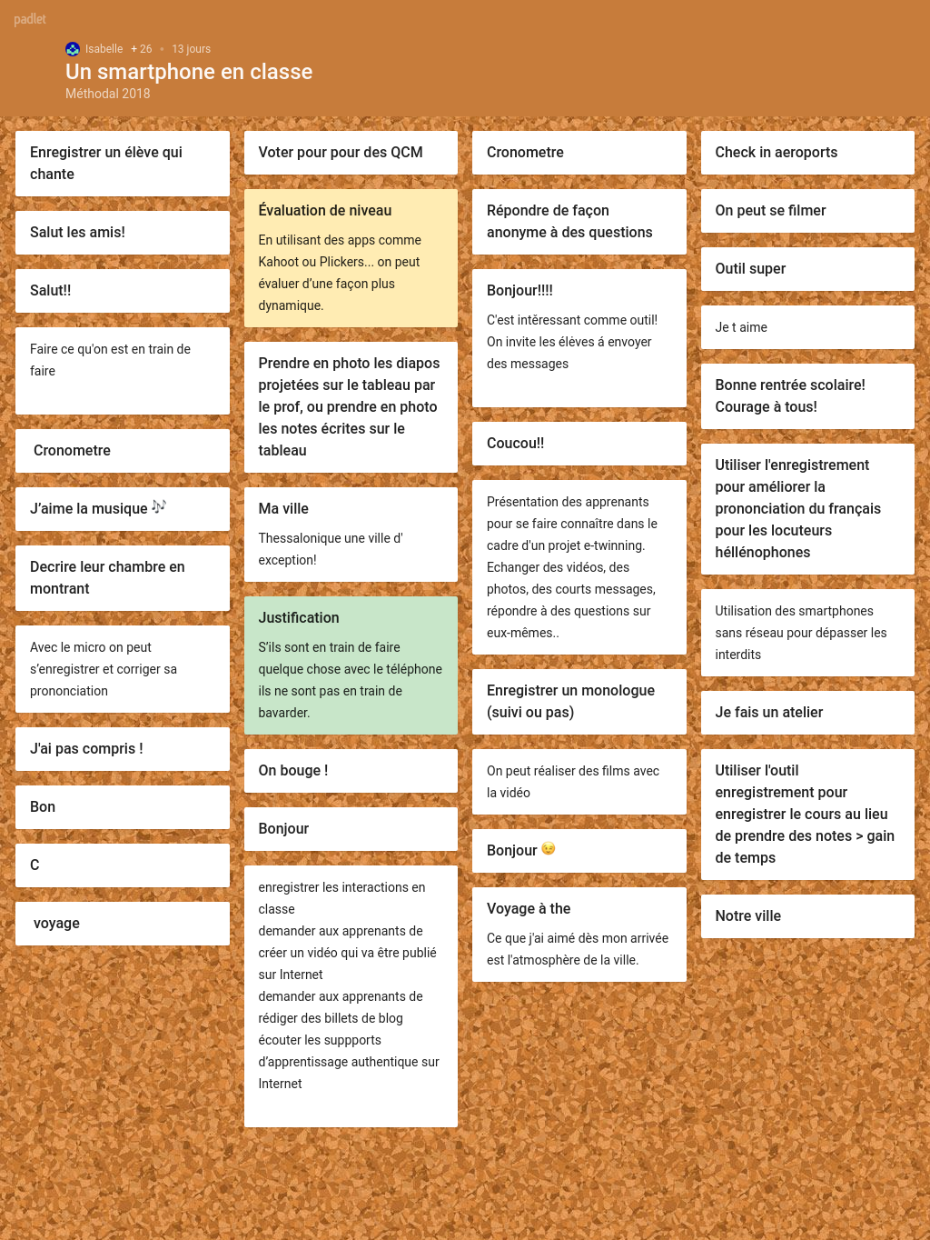 Nous avons vu quelles pouvaient être les utilisations personnelles d’un smartphone, voyons maintenant ce qu’il est possible d’en faire dans un cadre pédagogique. Pour cela, nous allons nous intéresser principalement à une utilisation de trois fonctions : l’appareil photo, la caméra, l’enregistrement audio dans le cadre d’un travail de groupe. Nous allons également nous appuyer sur un outil en ligne, disponible via le navigateur du téléphone, via une application ou, plus classiquement, via un ordinateur connecté à Internet : Padlet (http://padlet.com). Cet outil permet une publication sur un « mur » virtuel collectif de manière synchrone. (Seul l’enseignant doit créer un compte. Il lui suffira ensuite de communiquer l’adresse à ses apprenants). Toutes les activités possibles peuvent être réalisées en classe ou hors classe. L’interdiction officielle d’un smartphone en classe n’est donc plus un obstacle.