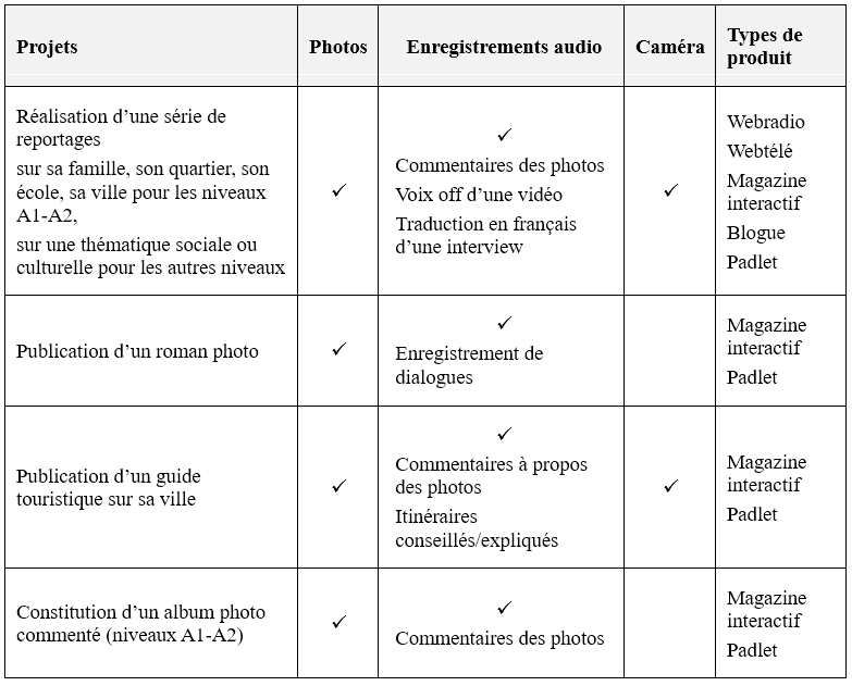 Le tableau ci-dessous présente quelques projets avec l’utilisation d’une ou plusieurs des fonctions : enregistrement audio, caméra, photo.